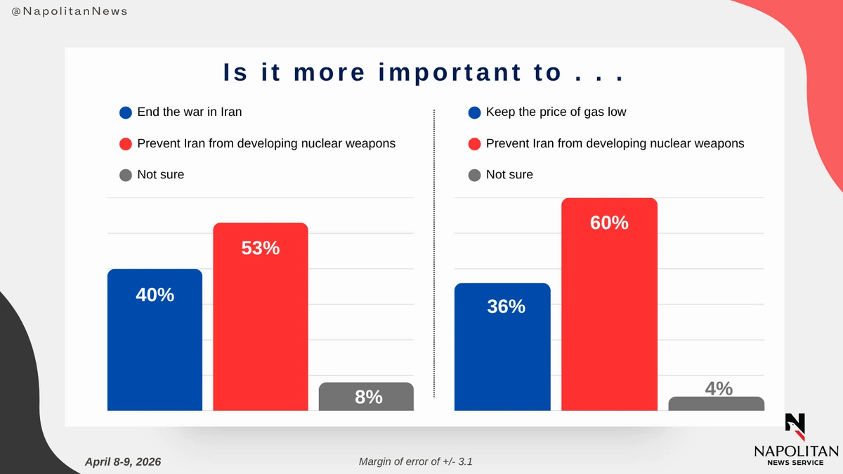 • With this in mind, 53% of voters say that it is more important to stop Iran from developing a nuclear weapon than it is to end the war in Iran, while 40% disagree.