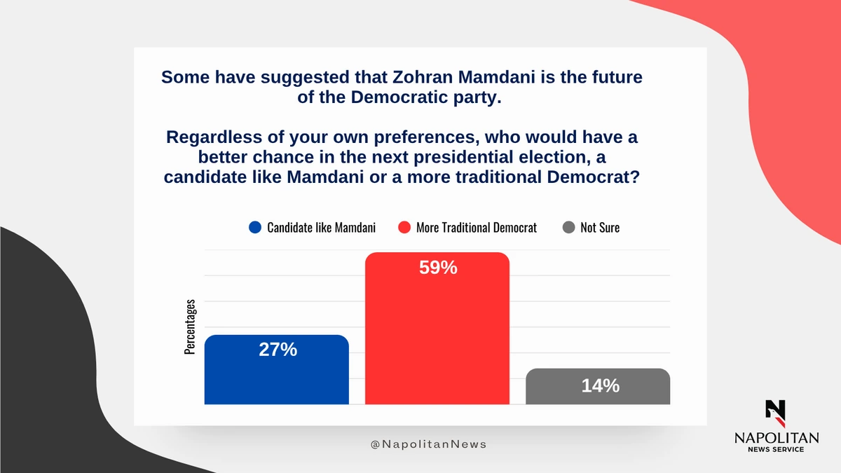 • While some have suggested that Zohran Mamdani is the future of the Democratic party, just 27% say that a candidate like Mamdani would have a better chance in the next presidential election than a more traditional Democrat.