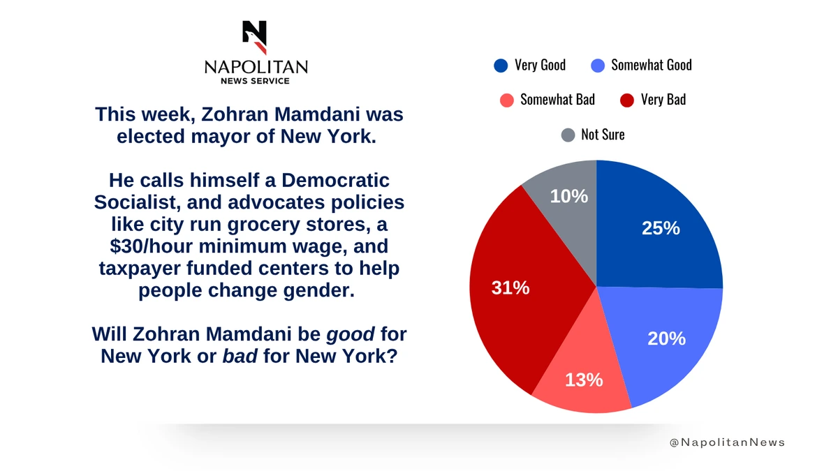 • Forty-five percent (45%) say newly elected New York City mayor Zohran Mamdani, a Democratic Socialist, will be good for New York, while 44% say he will be bad.