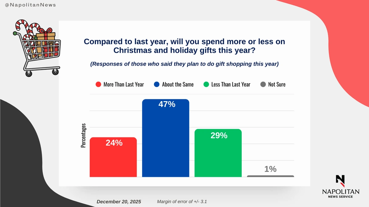 • Compared to last year, 47% of those who are holiday shopping say they will spend about the same as last year. One quarter (24%) will spend more, and 29% will spend less.