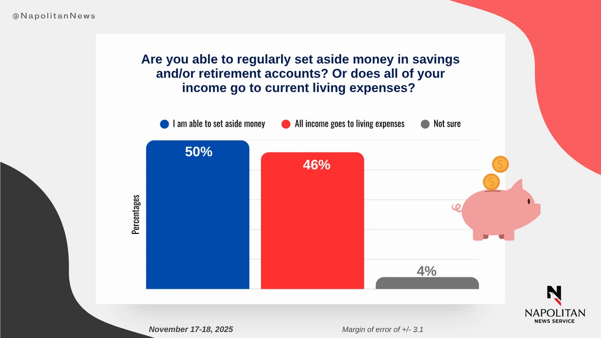• Half of voters (50%) say they can set aside money for savings, while 46% say all their money goes to living expenses.