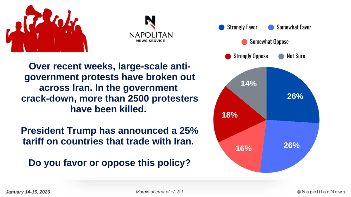 • When informed of Trump's 25% tariff on countries that trade with Iran, 52% of voters favor the policy, including 26% who Strongly Favor it.
