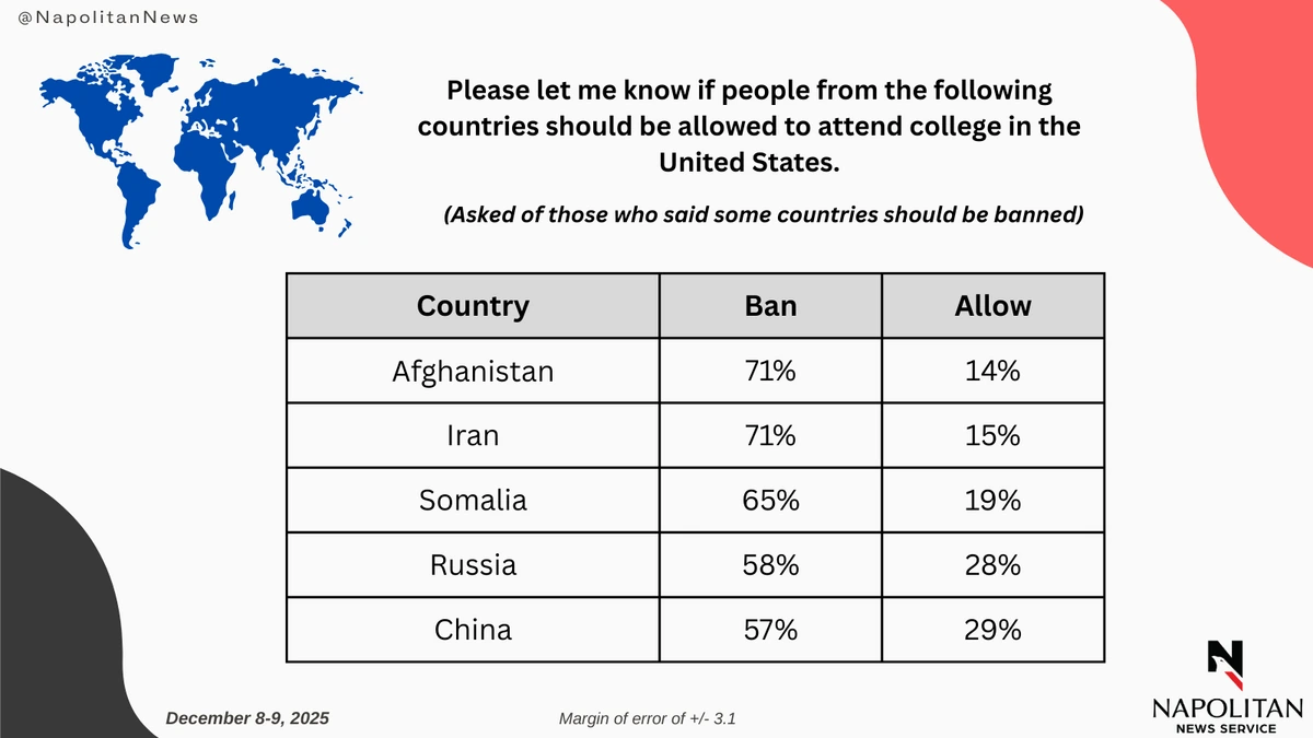• Among voters who agree that people from certain countries should be banned from attending college, voters most want to see bans placed on Iran (71%), Afghanistan (71%), and Somalia (65%).