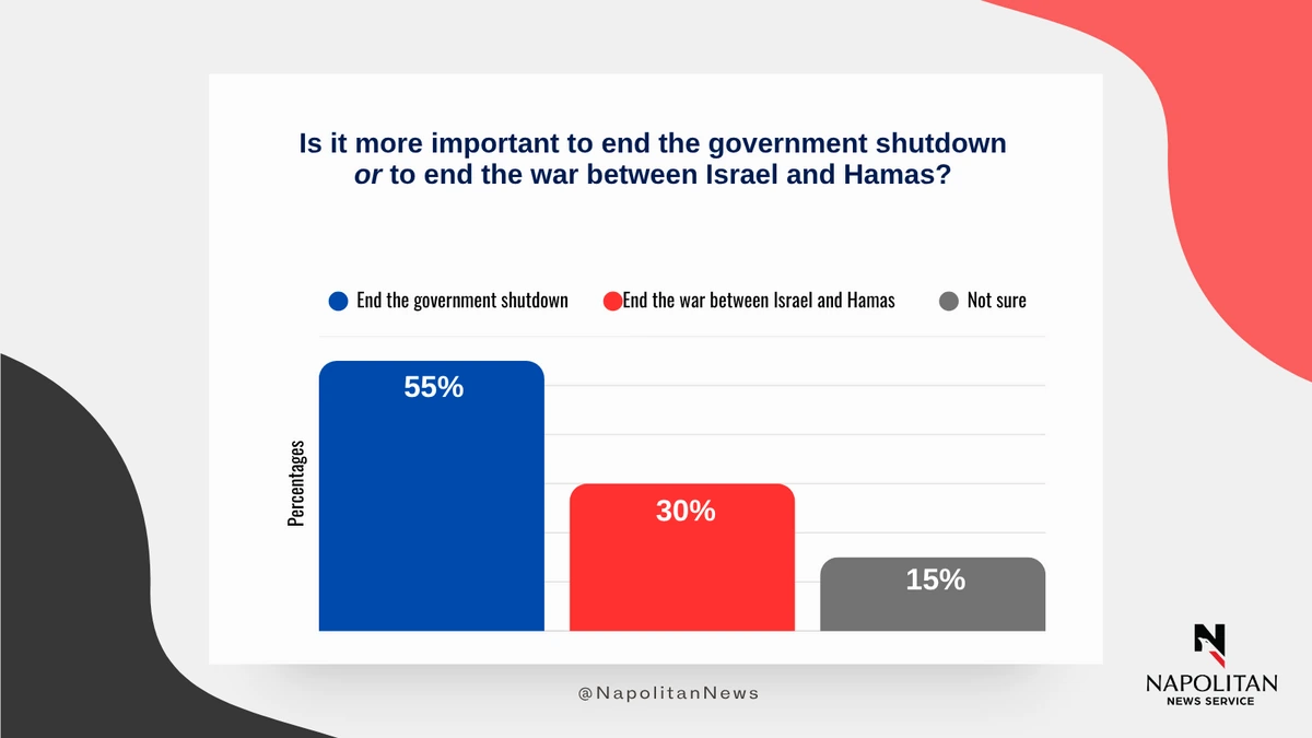 • More than half of voters (55%) believe that ending the U.S. government shutdown is more important than ending the war between Israel and Hamas.