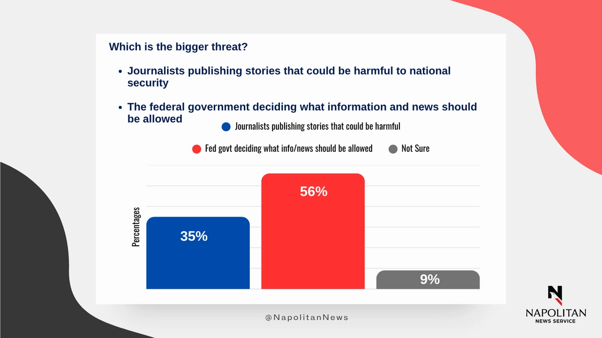 • Fifty-six percent (56%) say the federal government deciding what information and news should be allowed is a larger threat than journalists publishing stories that could be harmful to national security.