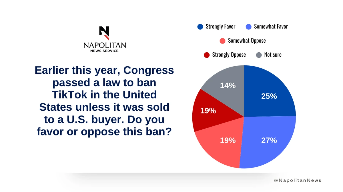 • Earlier this year, Congress passed a law to ban TikTok in the United States unless it was sold to a U.S. buyer, and 52% favor the ban.