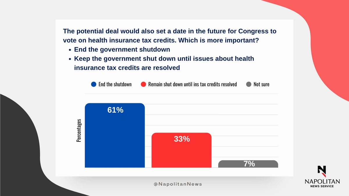 • A similar number (61%) of registered voters say it is more important to end the shutdown than to resolve the health insurance tax credit issues.