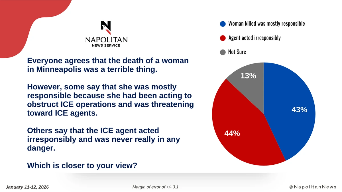 • On the tragedy of the Minnesota shooting, voters are seeing what they want to see: 44% blame the ICE officer, and 43% blame the woman who was shot.