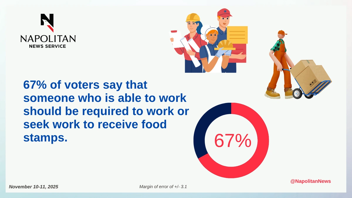 • Two thirds (67%) of voters say that if a person is able to work, they should be required to work, or seek work, in order to receive food stamps.