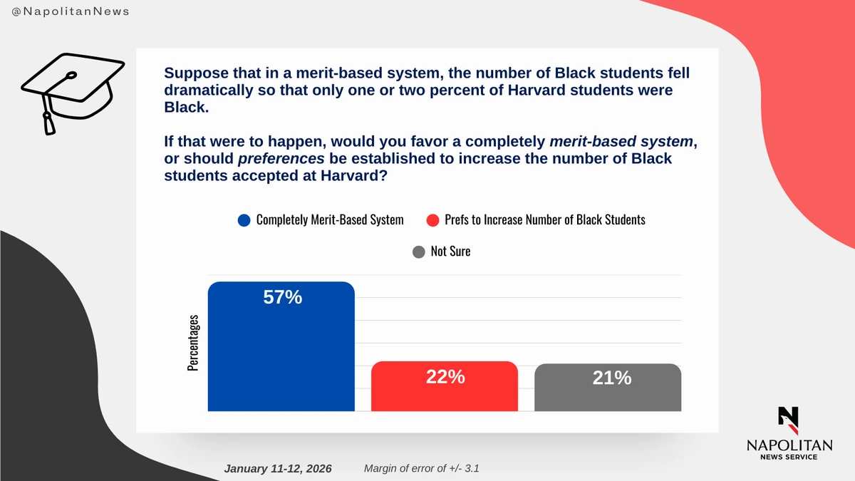 • If, in a merit-based system, the number of Black students fell dramatically so that only 1% or 2% of Harvard students were Black, 57% would still favor a completely merit-based system.