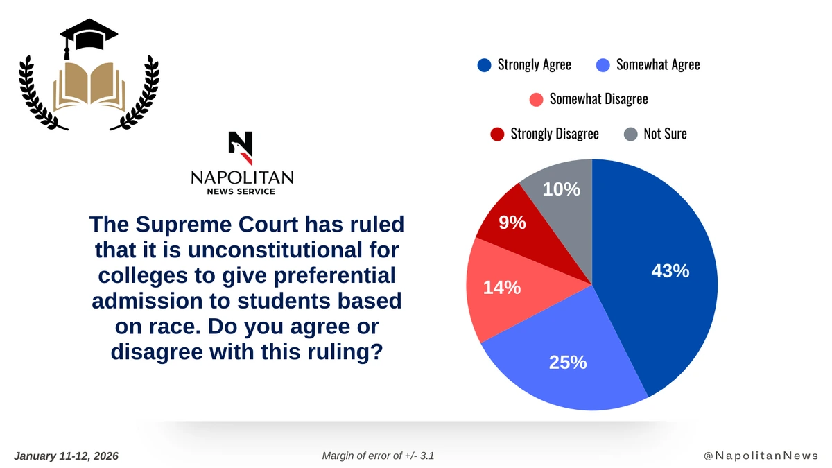 • A large majority (68%) of registered voters agree with the Supreme Court ruling that it is unconstitutional for colleges to give preferential admission to students based on race. Only 23% disagree.