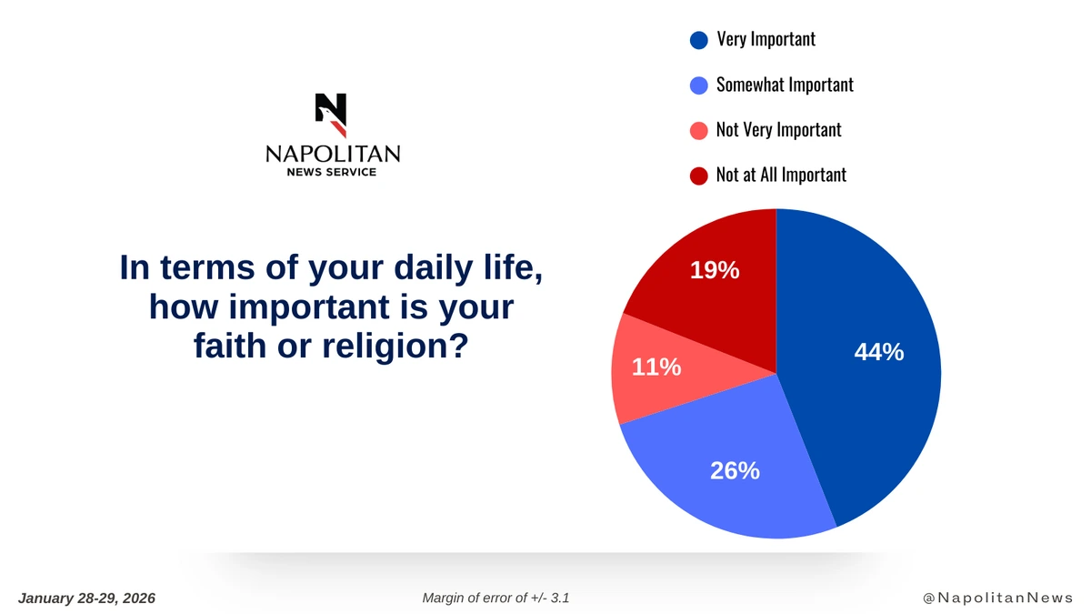 • In terms of their daily lives, 70% of registered voters say their faith or religion is important to them, with 44% saying it is Very Important.