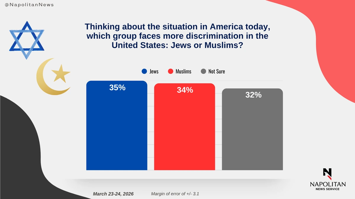 • These numbers are down 5 points each from December 2025, but they are similar to January 2022 when 37% said Jews face more discrimination, and 35% said Muslims faced more.