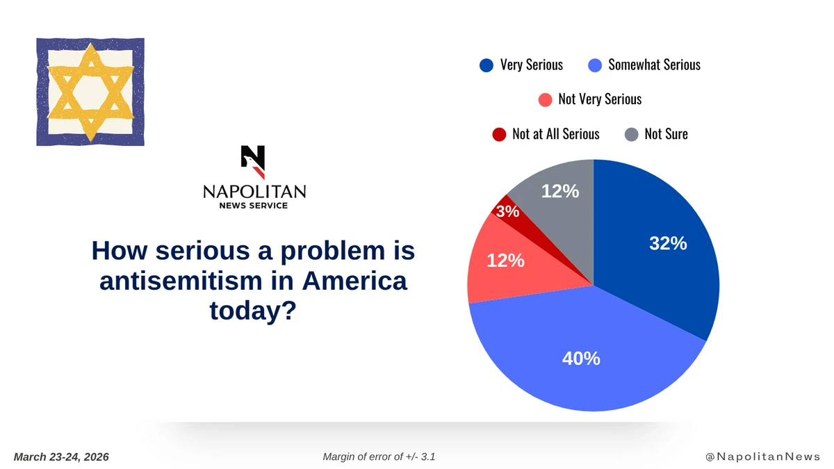 • Almost three quarters (72%) of voters say that antisemitism is a serious problem in America today, with 35% saying it's Very Serious.