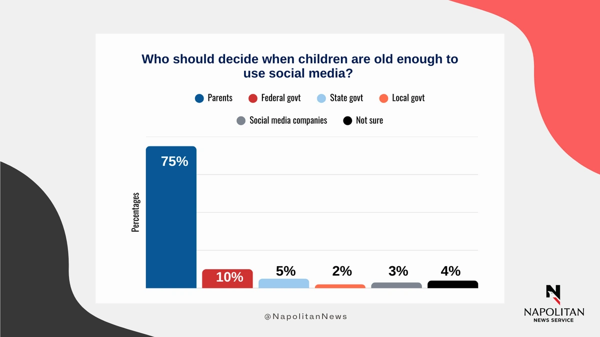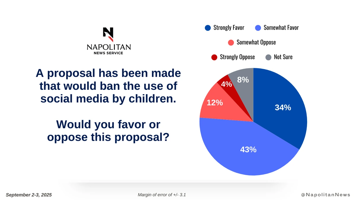 • 77% of registered voters favor a proposal to ban the use of social media by children.
