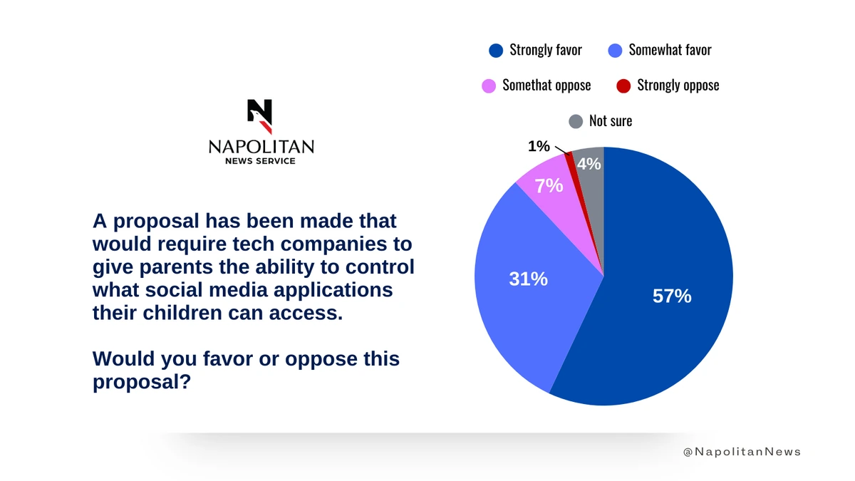 • An overwhelming 89% of voters favor requiring tech companies to give parents control of what social media applications their children can access.