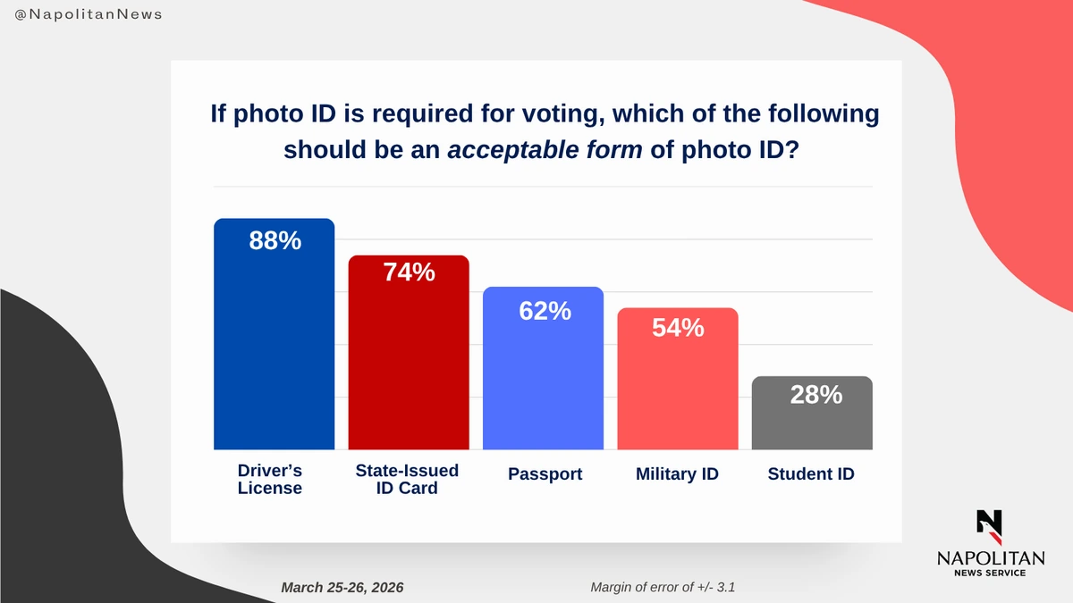 This data is from a Napolitan News Service survey of 1,000 Registered Voters conducted online by Scott Rasmussen, March 25-26, 2026. RMG Research, Inc., conducted the field work for the survey. It has a margin of error of +/- 3.1.