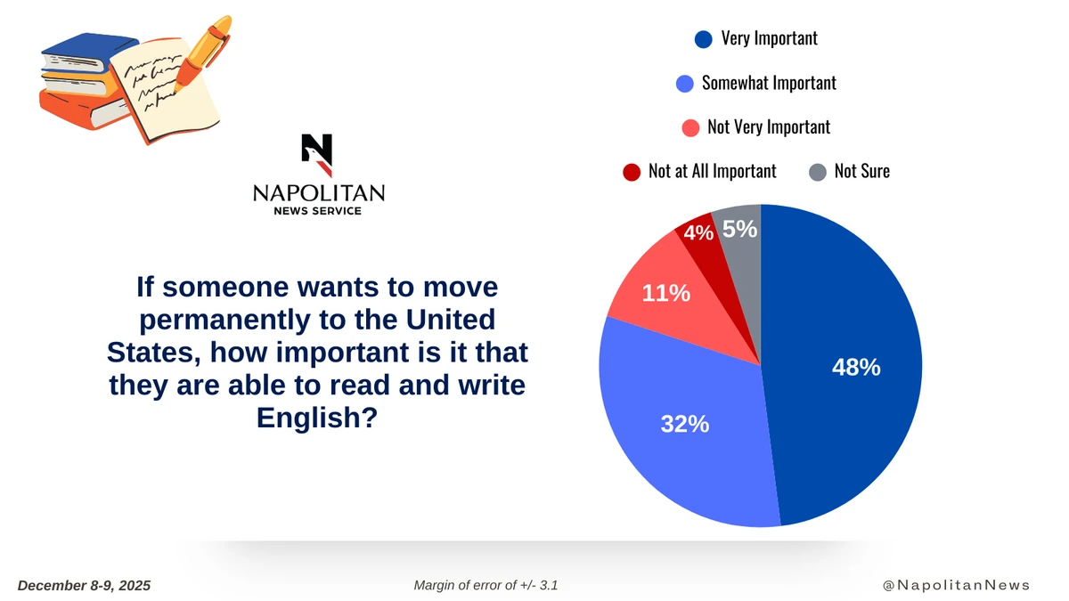 • Along a similar vein, if someone wants to move permanently to the United States, 80% of voters say it is important that they are able to read and write English, with 48% saying it is Very Important.