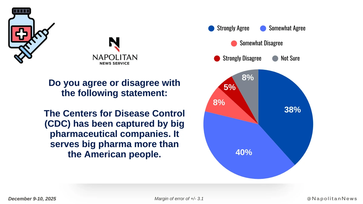 • More than three quarters (78%) of registered voters at least Somewhat agree that the Centers for Disease Control (CDC) has been captured by big pharmaceutical companies, and that the CDC serves big pharma more than the American people.