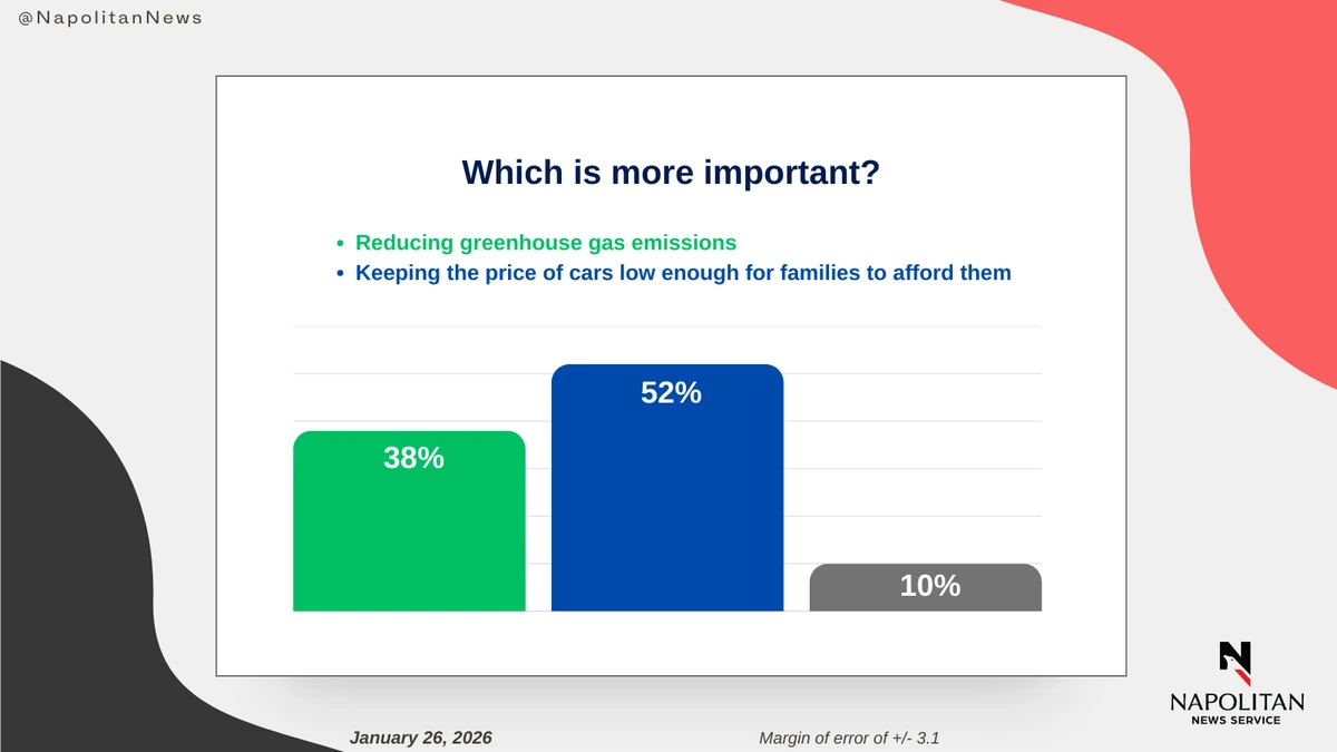• About half (52%) of voters say keeping the price of cars low enough for families to afford them is more important than reducing greenhouse gas emissions to combat climate change.