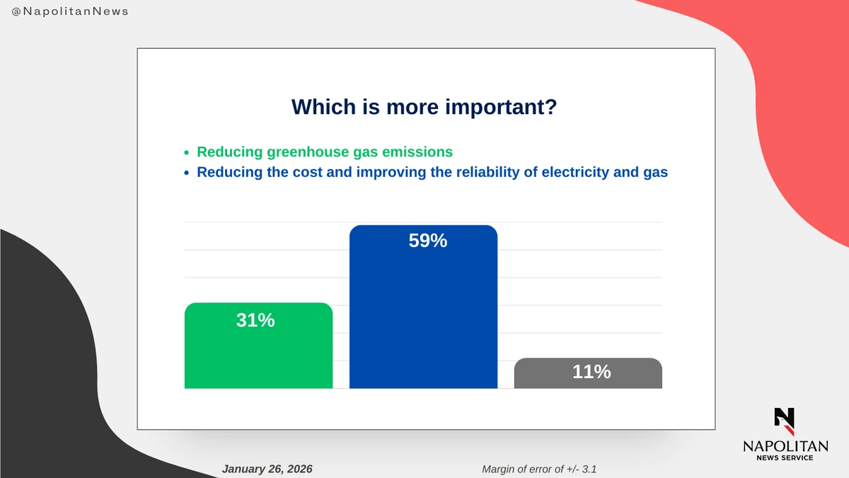 • In a similar vein, about 6 in 10 (59%) of voters say reducing the cost and improving the reliability of electricity and gas for American families is more important than reducing greenhouse gas emissions.