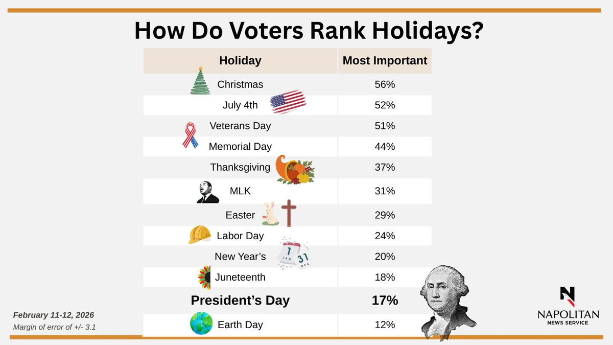 • Just 17% of registered voters believe that Presidents' Day is one of our nation's most important holidays.