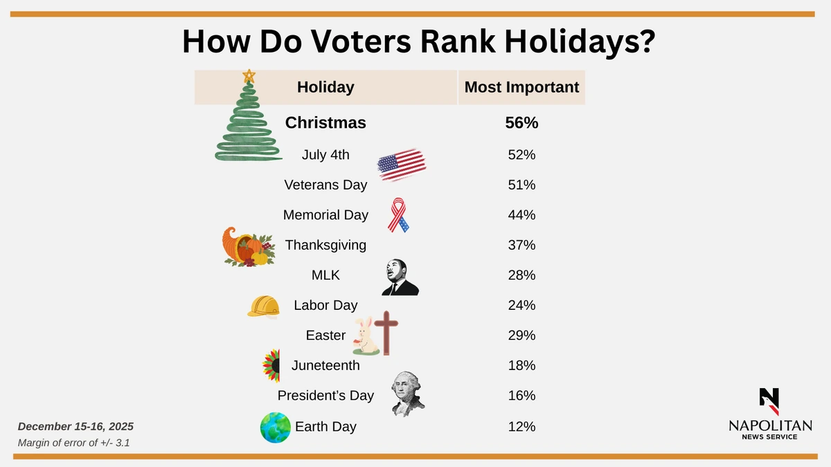• Christmas continues to be considered America's most important holiday, with 56% of voters saying it is one of our nation's most important holidays.