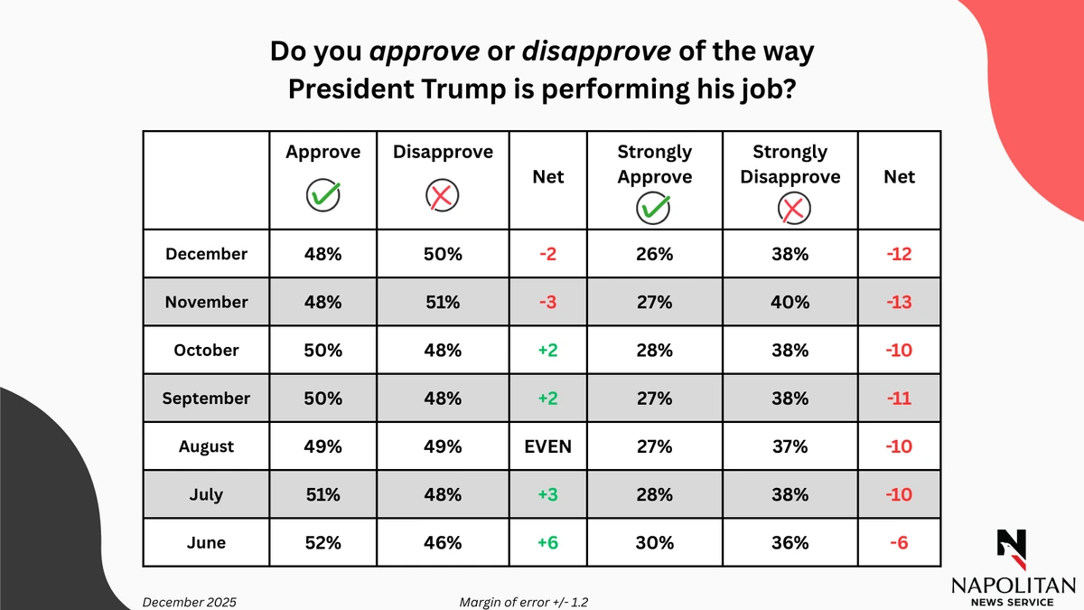 • The Napolitan News survey of 7,215 Registered Voters found that 50% also disapprove (down 1 point from November).