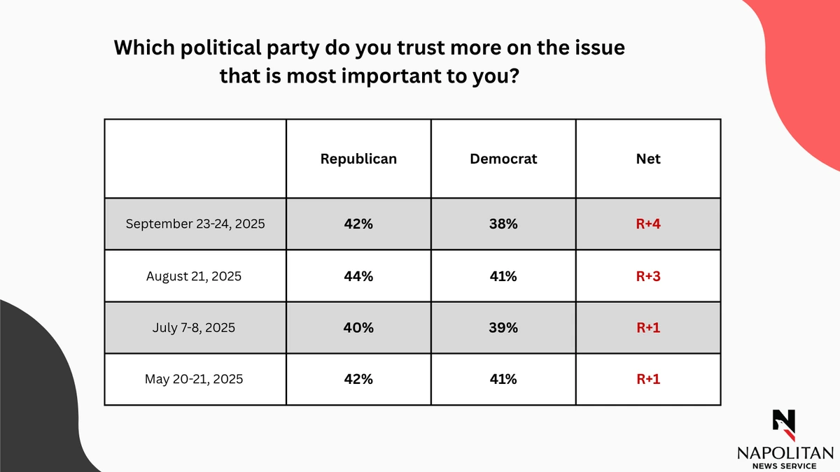 The most recent data cited is from a Napolitan News Service survey of 1,000 Registered Voters conducted online by Scott Rasmussen, September 24-25, 2025. Field work for the survey was conducted by RMG Research, Inc. and has a margin of error of +/- 3.1.
