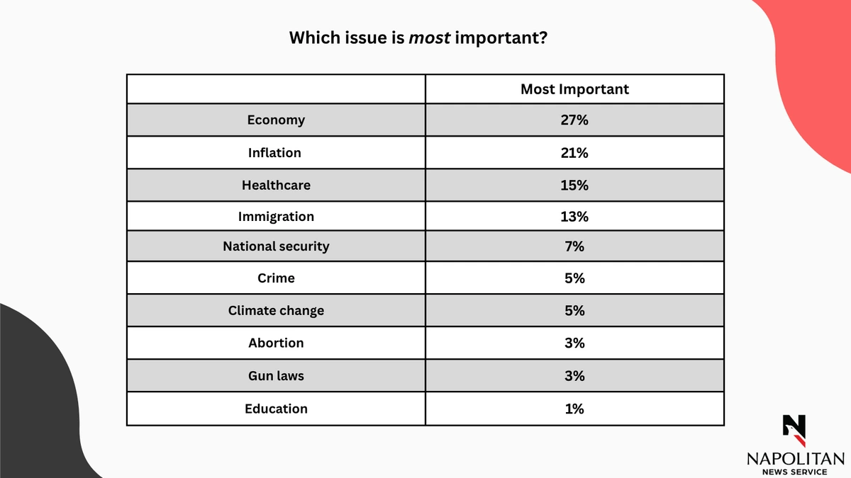 • Among 1,000 registered voters, Inflation (21%), Healthcare (15%) and Immigration (13%) also rank highly.