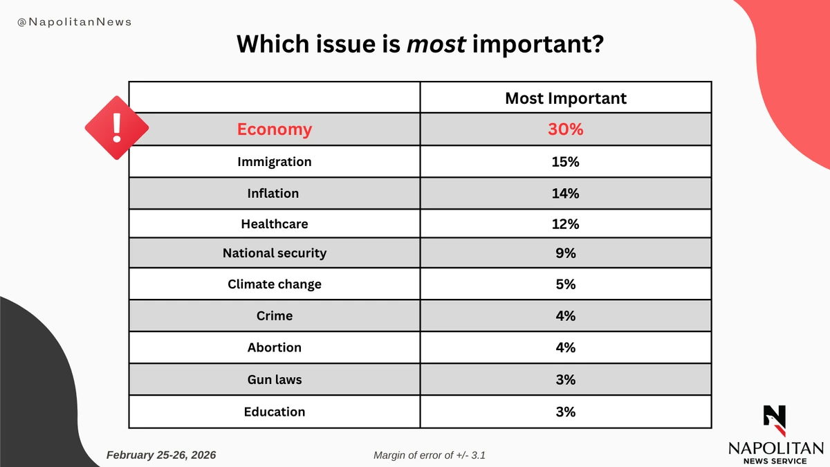 This data is from a Napolitan News Service survey of 1,000 Registered Voters conducted online by Scott Rasmussen, February 25-26, 2026. RMG Research, Inc., conducted the field work for the survey. It has a margin of error of +/- 3.1.