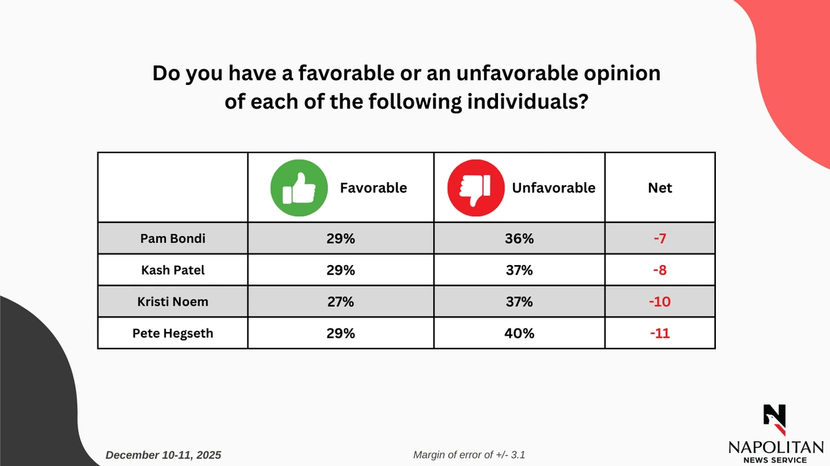 • With similar ratings to Patel, United States Attorney General Pam Bondi has a favorable rating of 29% and an unfavorable rating of 36%.
