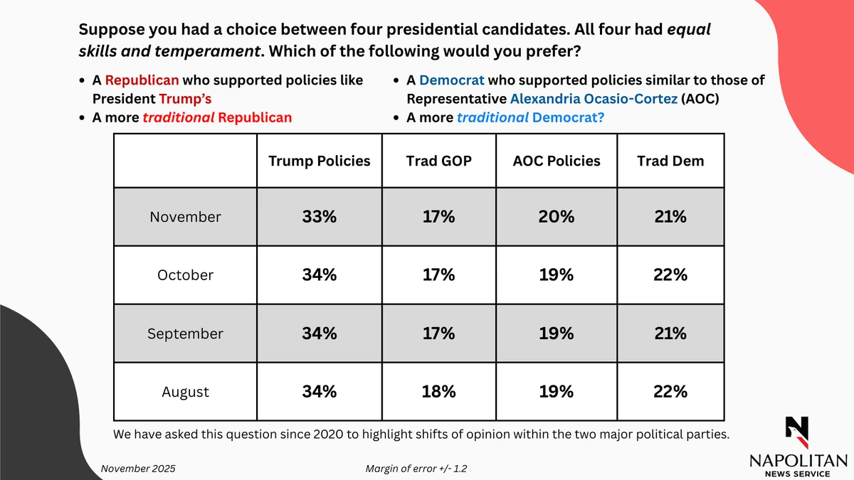 - A Napolitan News survey of 6,186 Registered Voters in November found 21% would favor a traditional Democrat.