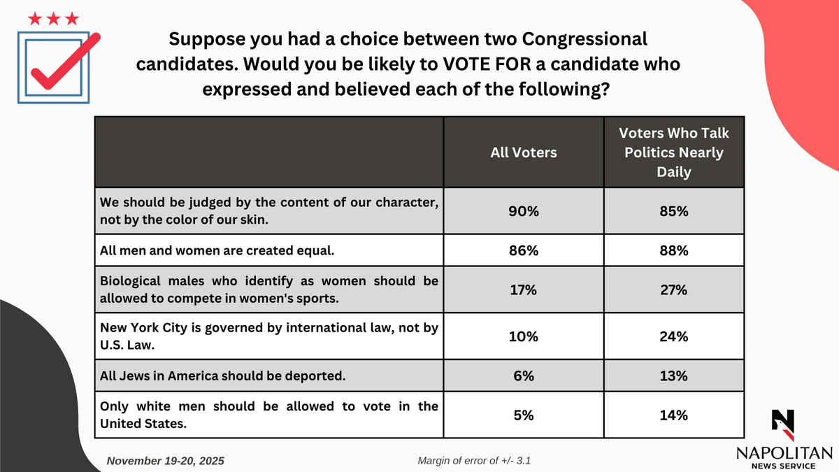 • Ten percent (10%) would prefer a Congressional candidate who believes New York City is governed by international law and not U.S. law.