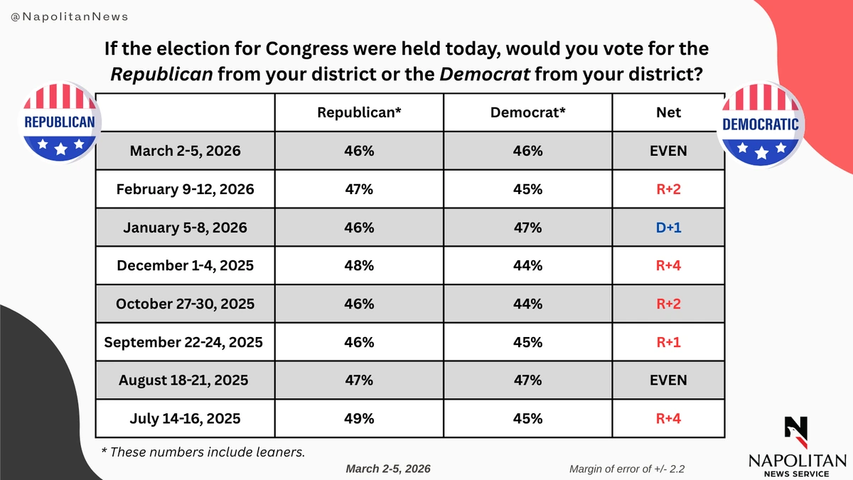 This data is from a Napolitan News Service survey of 2,000 Registered Voters conducted online by Scott Rasmussen, March 2-5, 2026. RMG Research, Inc., conducted the field work for the survey. It has a margin of error of +/- 3.1.