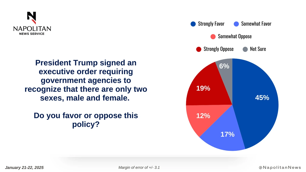 • And, 62% of voters favor President Trump's Executive Order requiring government agencies to recognize only two sexes, male and female.