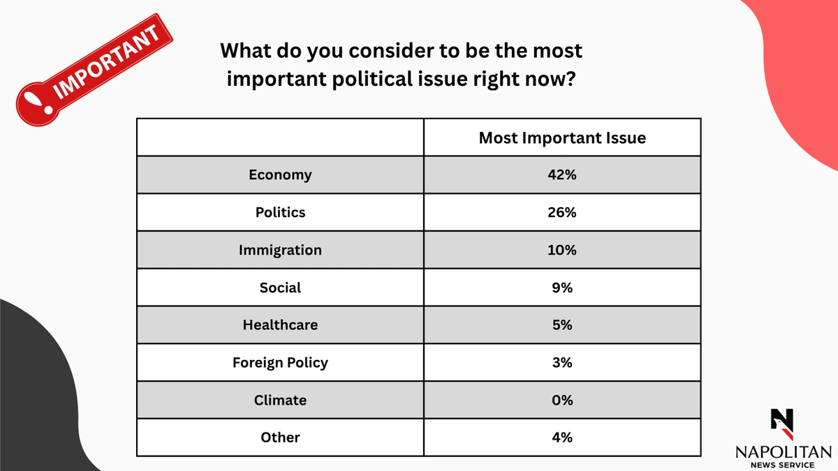 • Among 2,000 Registered Voters, politics (26%), immigration (10%), and social issues (9%) also ranked highly.