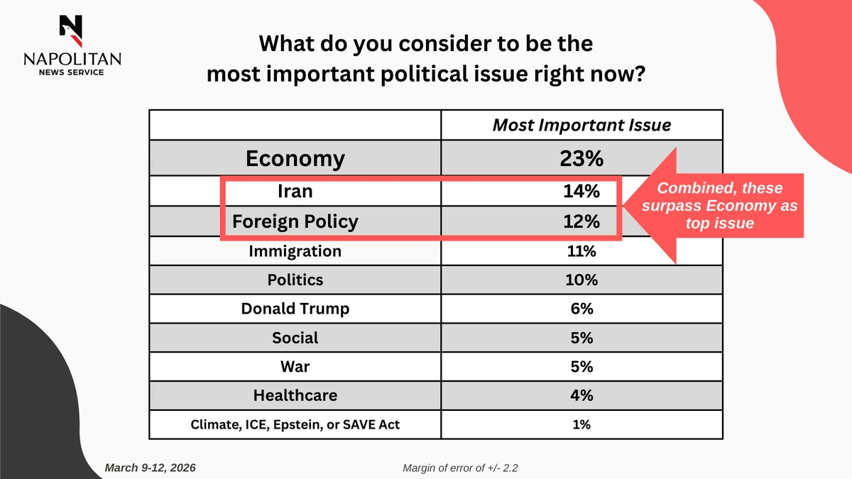 This data is from a Napolitan News Service survey of 2,000 Registered Voters conducted online by Scott Rasmussen, March 9-12, 2026. RMG Research, Inc., conducted the field work for the survey. It has a margin of error of +/- 2.2.