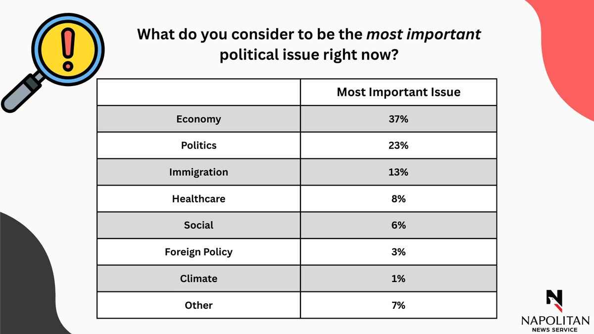 • Among 2,000 Registered Voters, Politics (23%) and Immigration (13%) also ranked highly.
