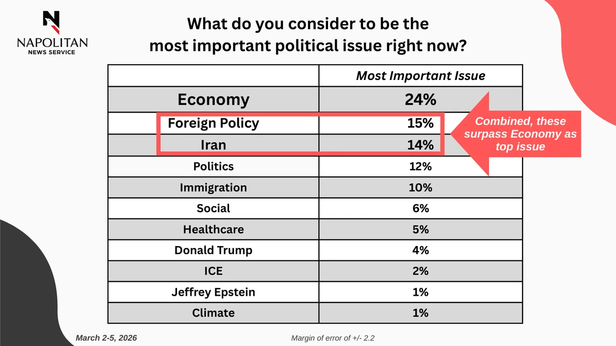 - The war in Iran has temporarily displaced the Economy as the most important issue for voters.