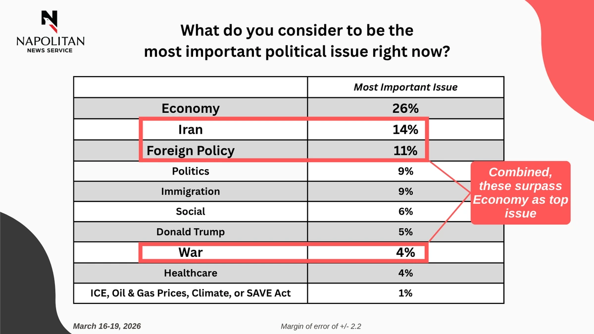 This data is from a Napolitan News Service survey of 2,000 Registered Voters conducted online by Scott Rasmussen, March 16-19, 2026. RMG Research, Inc., conducted the field work for the survey. It has a margin of error of +/- 2.2.