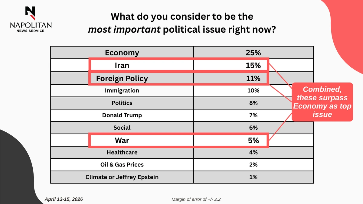 • The war in Iran still dominates concerns about the Economy as the most important issue for voters.