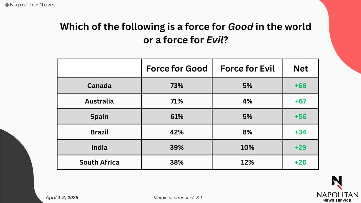 • Smaller percentages take a more neutral approach and say Australia (20%), Canada (19%), and Spain (25%) are neither forces for good nor evil.