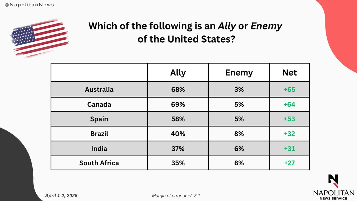 This data is from a Napolitan News Service survey of 1,000 Registered Voters conducted online by Scott Rasmussen, April 1-2, 2026. RMG Research, Inc., conducted the field work for the survey. It has a margin of error of +/- 3.1.