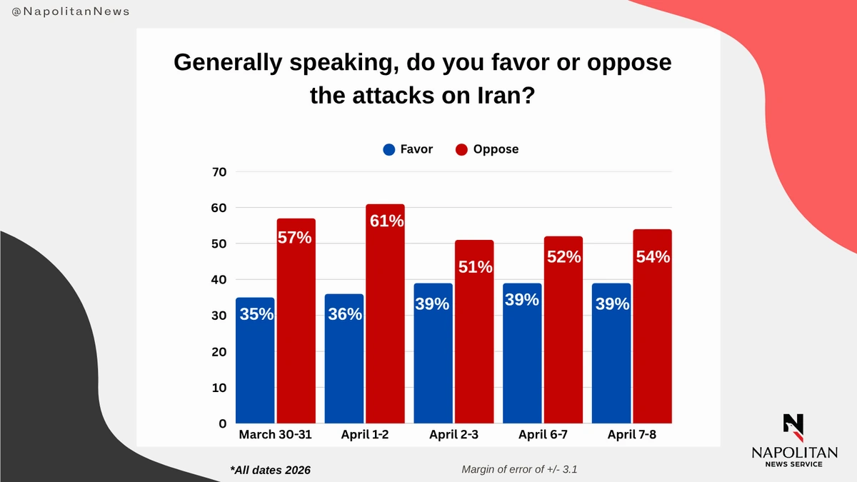 This data is from a Napolitan News Service survey of 1,000 Registered Voters conducted online by Scott Rasmussen, April 8-9, 2026. RMG Research, Inc., conducted the field work for the survey. It has a margin of error of +/- 3.1.