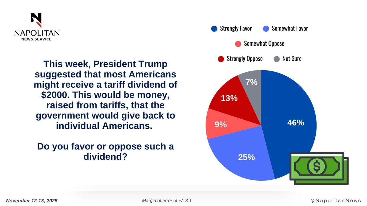 • Seventy-one percent (71%) of registered voters favor the idea of a $2000 tariff dividend, an idea floated earlier this week by President Trump.
