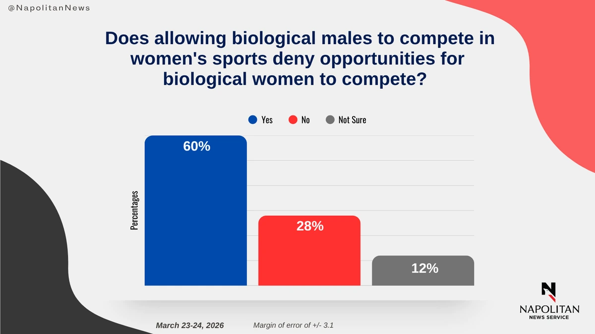 • Six in 10 voters (60%) say that allowing biological males to compete in women's sports denies opportunities for biological women to compete.