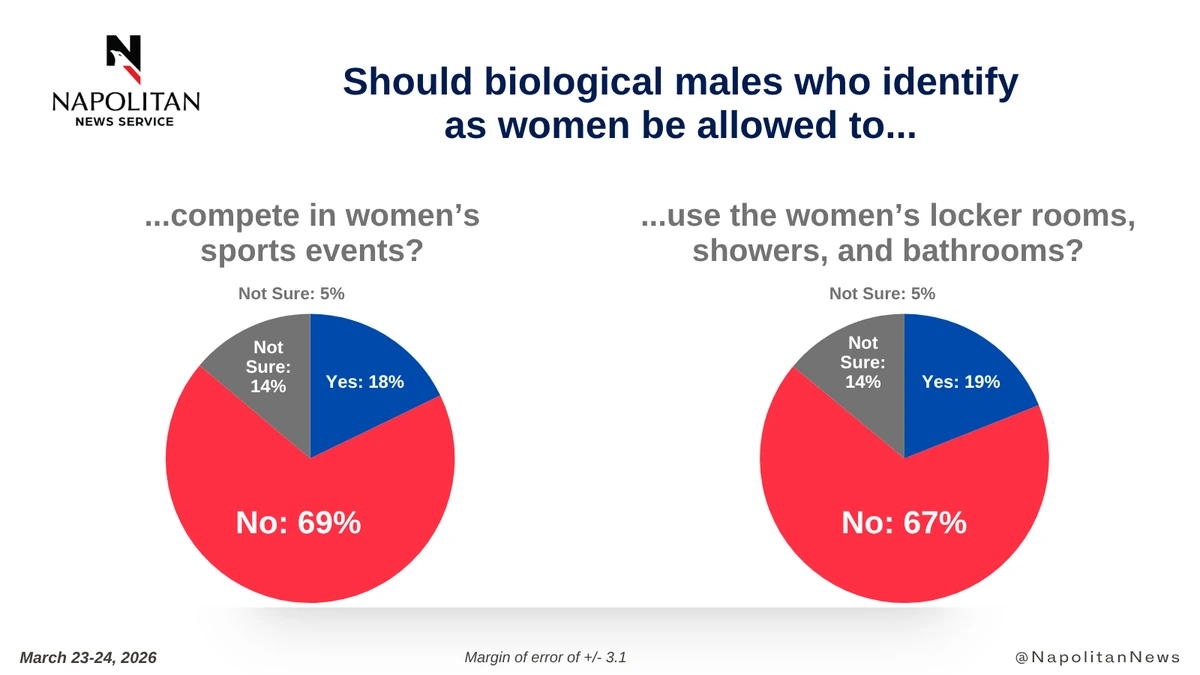 • Seven out of 10 voters (69%) believe biological males who identify as women should not be allowed to compete in women's sports events.