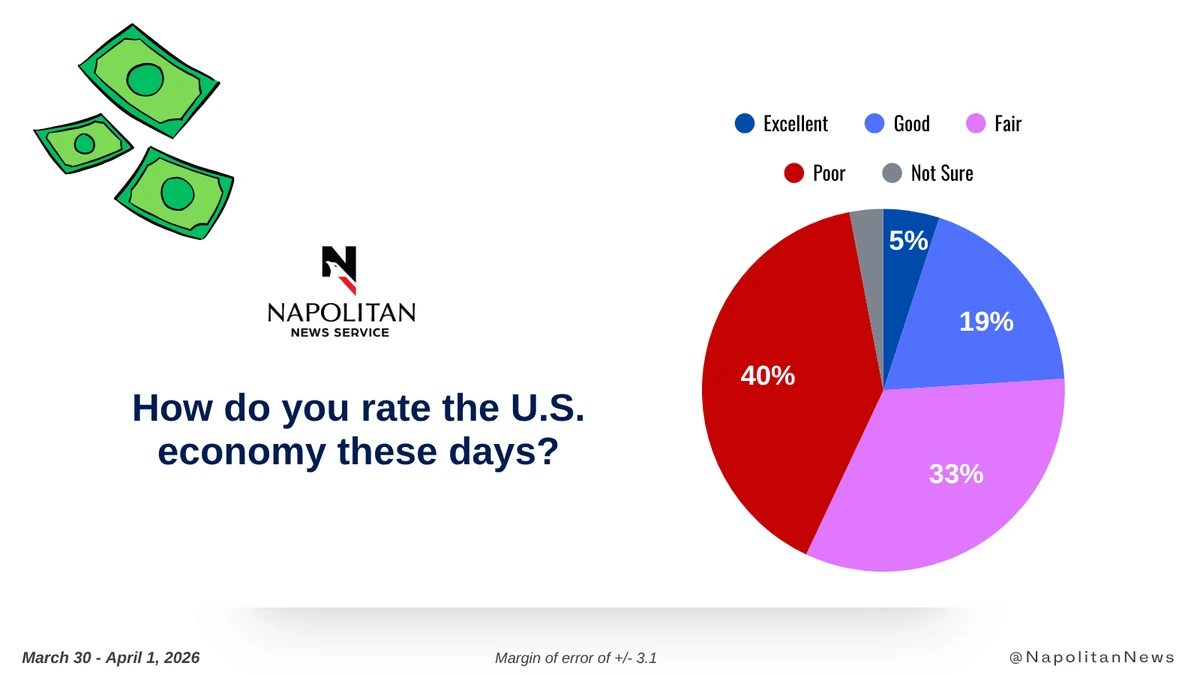 This data is from a Napolitan News Service survey of 1,000 Registered Voters conducted online by Scott Rasmussen, March 30-31, 2026. RMG Research, Inc., conducted the field work for the survey. It has a margin of error of +/- 3.1.