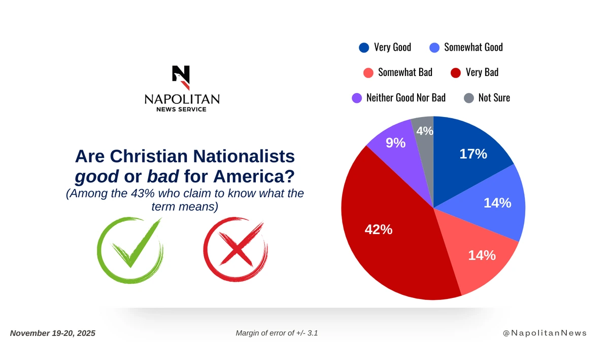 • Among those who claim to know what the term means, most (56%) say Christian Nationalists are bad for America, while 31% say it is good.